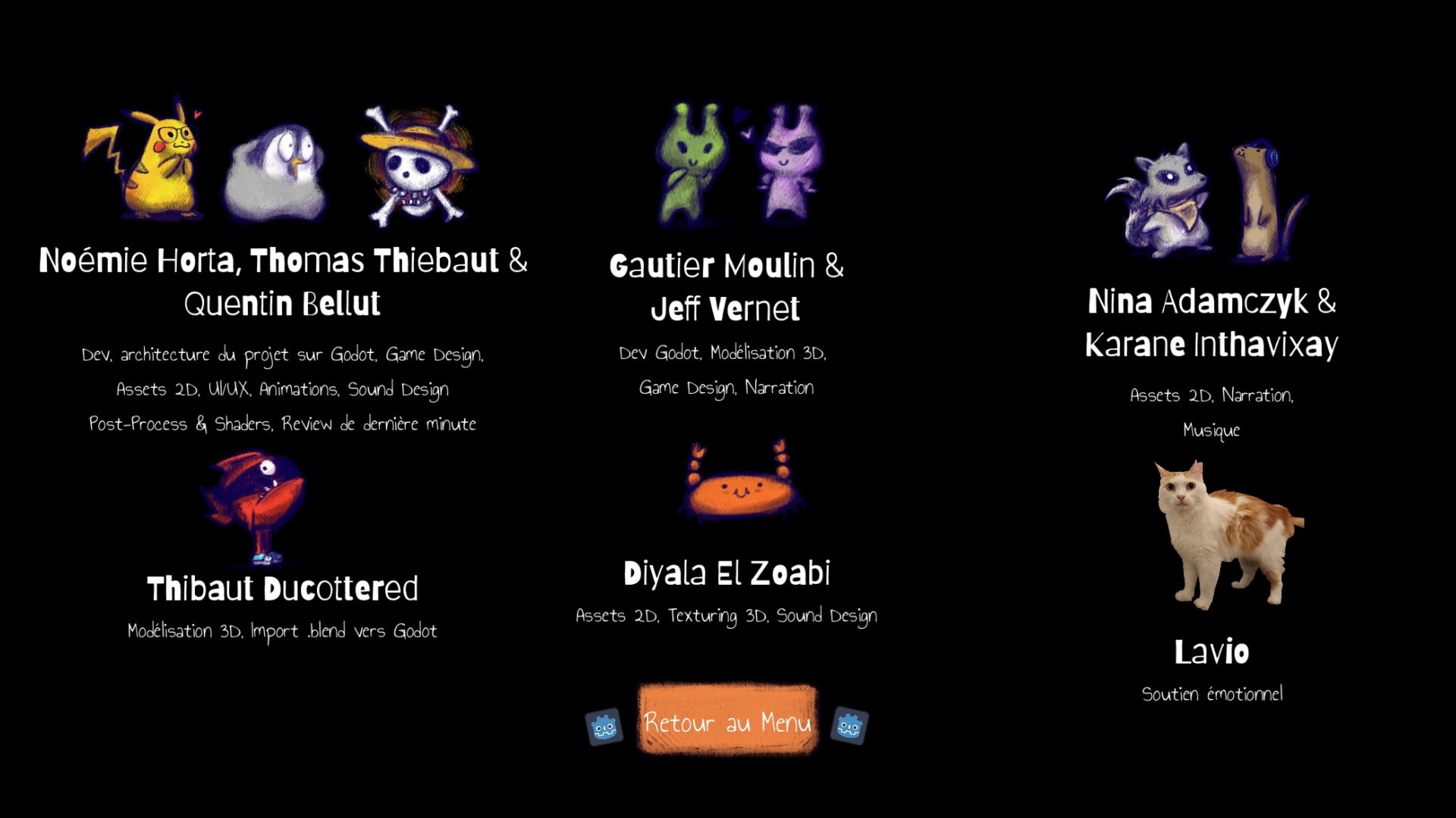 Noémie Horta - ( https://colenico.itch.io/ - https://www.colenico.com/ ) : Dev, Architecture du projet, Game design, Assets 2D, UI/UX, Animations, Sound Design, Post-processing.